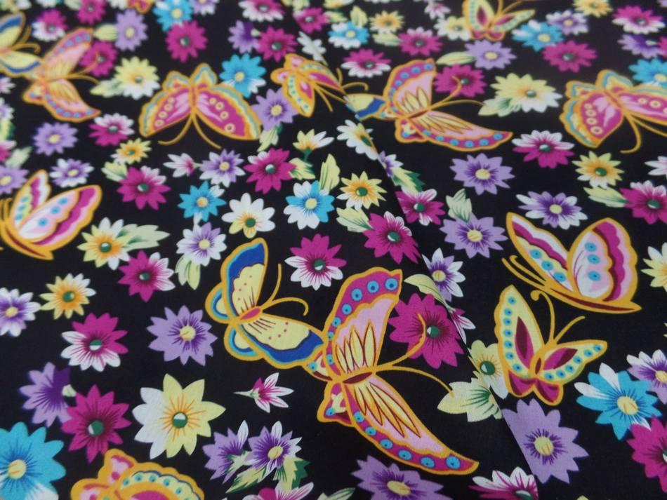 coton 100% noir imprimé papillon ton jaune ,rose ,bleu