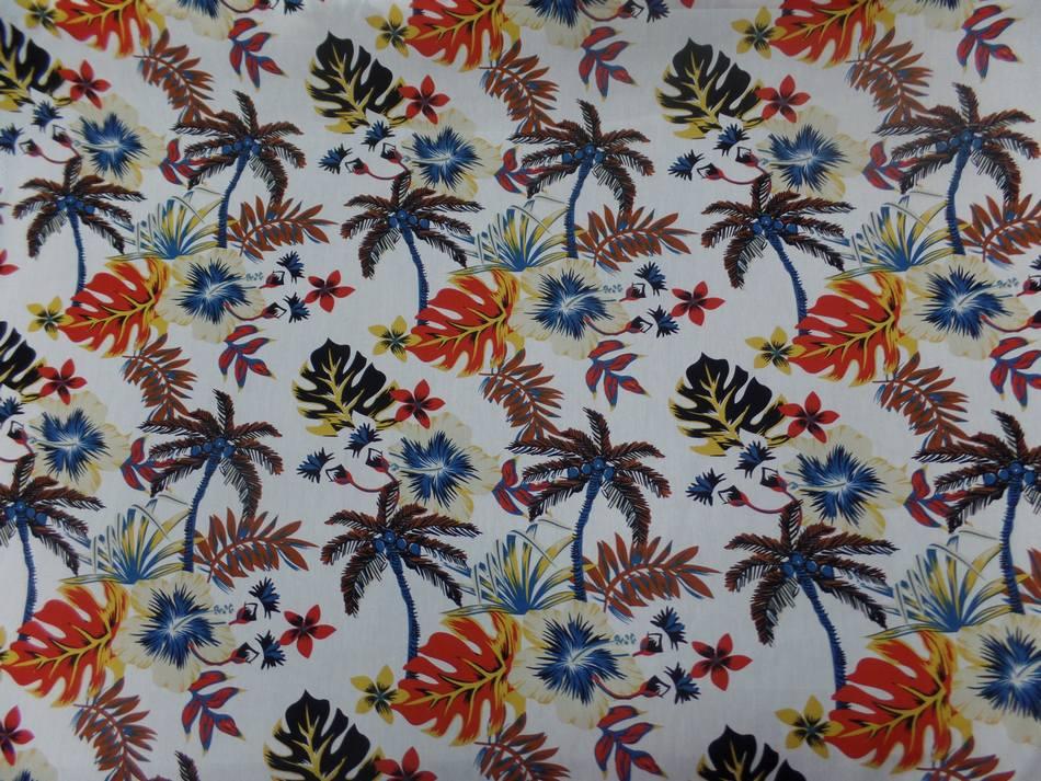Coton popeline blanche imprimé hawaïen ton beige,noir,rouge,bleu,marron blanc, bleu ,noir,marron