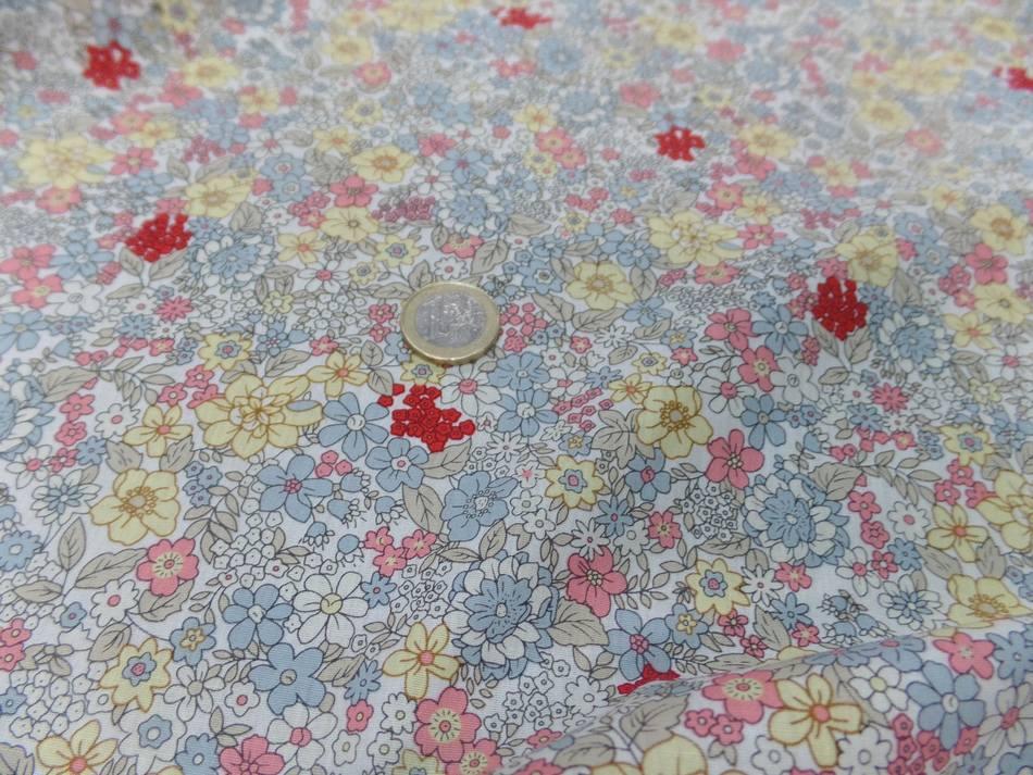 Coton popeline blanche imprimé liberty fleurs ton gris,jaune;rose et rouge ,