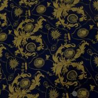 Coton popeline bleu nuit imprimé motifs jaune doré