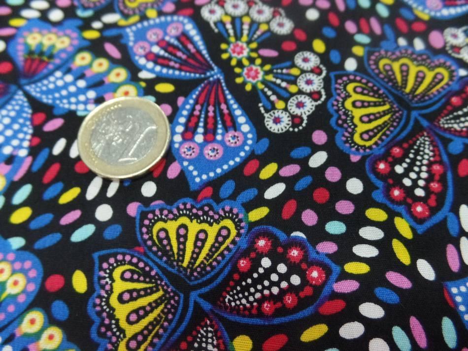 Coton popeline noire imprimé liberty motifs papillon jaune,bleu,rouge ,