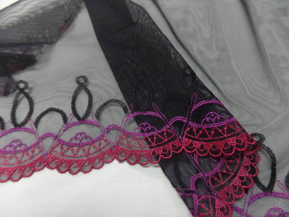 Galon de résille dentelle noire brodé ton rouge ,prune ce galon mesure 25cm de large . il est légèrement extensible dans la longueur . idéal pour réaliser ,vêtements ,dessous féminin , costume de spectacle ou en décoration. a noter qu il est transparent