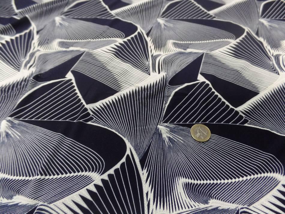 lycra façonné imprimé ton bleu nuit et blanc qui est extensible lycra dans les 2 sens . tissu léger et résistant ,pour réaliser : maillot de bain ,juste au corps ,vêtements , costume de danse .