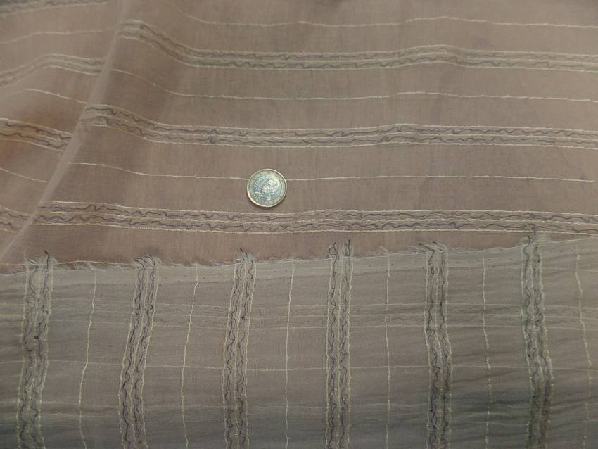mousseline de soie fine façonné a bandes dans la largeur , étoffe très souple ,légèrement transparent , elle a un touché très doux et très agréable .