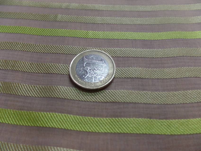 mousseline de soie écrue façonné bande ton kaki clair et anis en 1.40m de large.