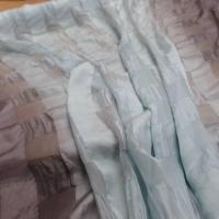 mousseline de soie vert d'eau façonné carreaux a bordure marron , étoffe très souple ,légèrement transparent , elle a un touché très doux et très agréable mousseline de soie 100%