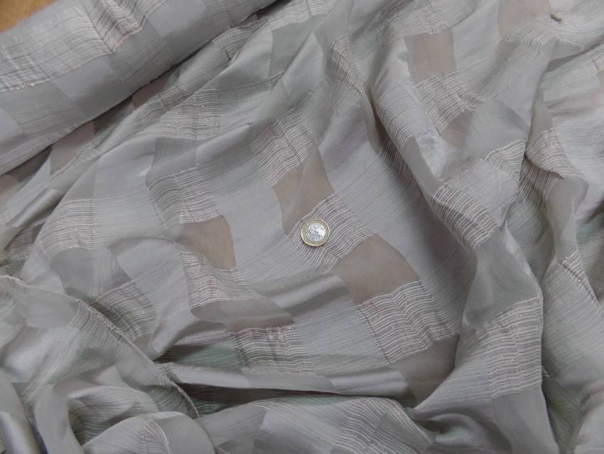 mousseline de soie beige façonné carreaux lurex doré , étoffe très souple ,légèrement transparent , elle a un touché très doux et très agréable mousseline de soie 100%