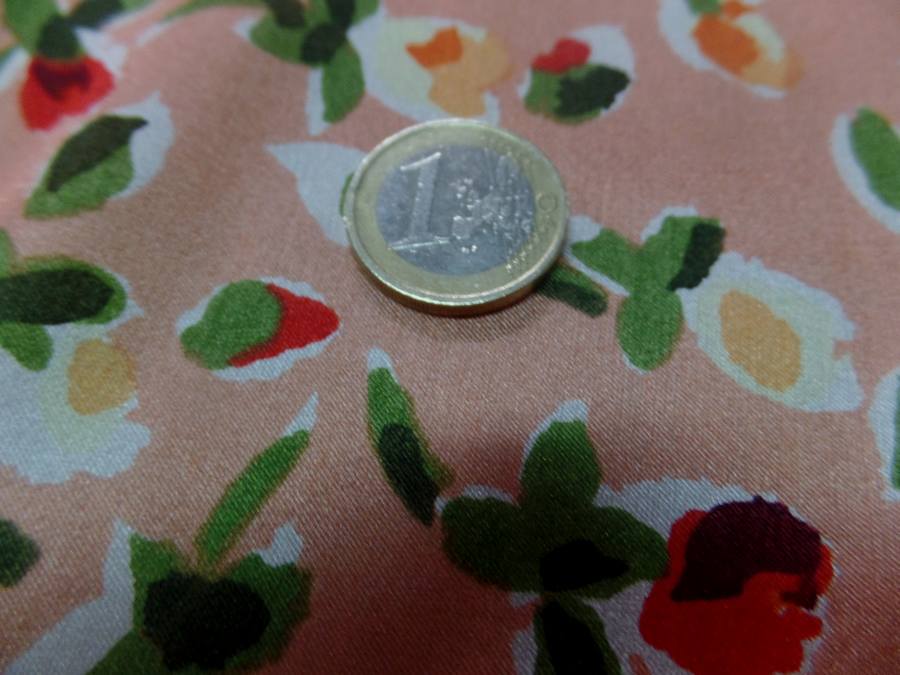 twill se soie saumon imprimé fleurs en 1.20m de large , (pas transparent) étoffe qui a un touché très doux et très agréable. soie 100% .