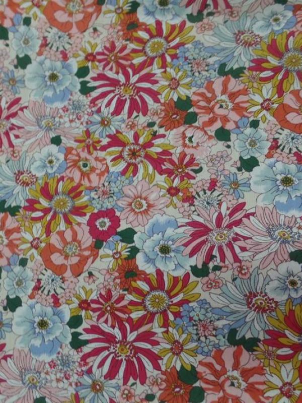 coupon de popeline coton 100% imprimé fleurs ton rouge, orange, bleu 0.90m