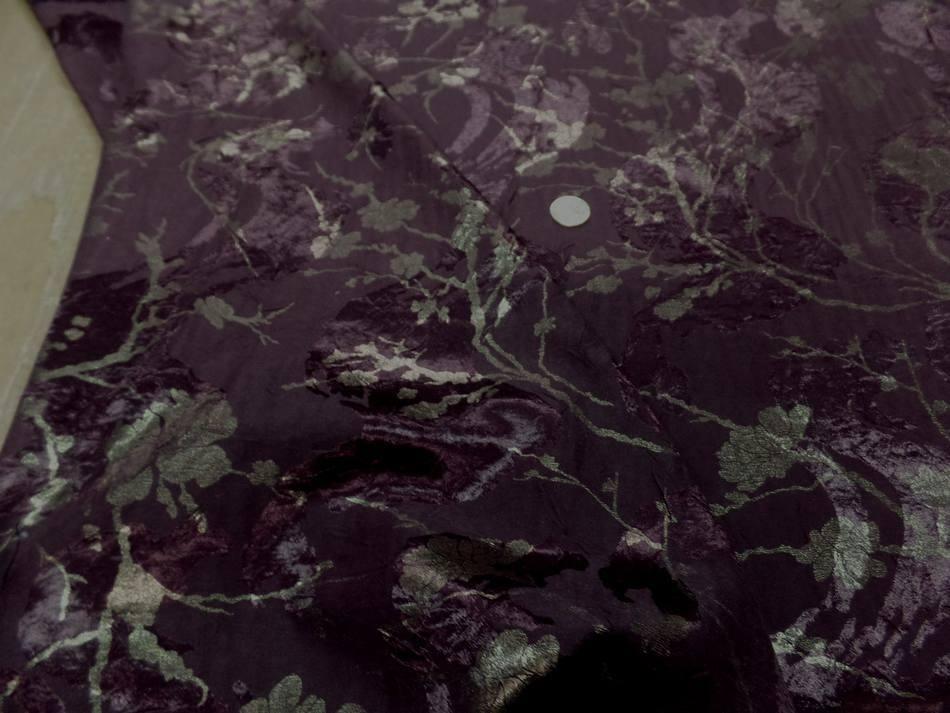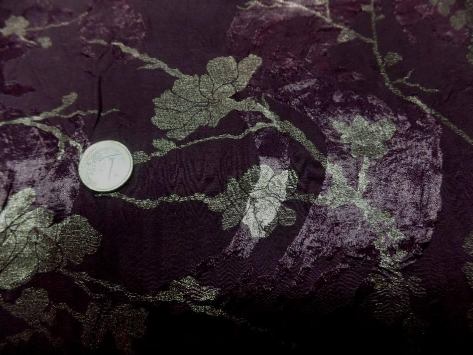 satin viscose double face aubergine froissé permanent imprimé fleurs doré en 1.45m de large . ce tissu est assez fin et souple avec peu de tenue. il conviendrait pour faire un chemisier ,une robe ou en décoration ,costume de spectacle ,carnaval etc ....