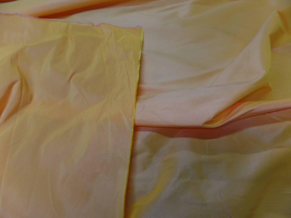 taffetas changeant jaune a reflets rose , c est un tissu fin et souple avec une légère tenue , tissu qui peut servir pour réaliser des vêtements , robe etc ...