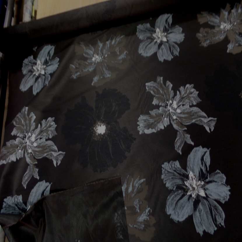 taffetas d ameublement changeant marron ,noir imprimé grosses fleurs taupe,gris
