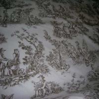 Coton fin blanc imprimé toile de jouy marron en 2.80m de large , ce tissu est en coton pas épais , souple et pas transparent, il peut servir pour faire des vêtements,en ameublement décoration , très belle qualité de coton idéale pour réaliser des draps ,tenture par exemple .