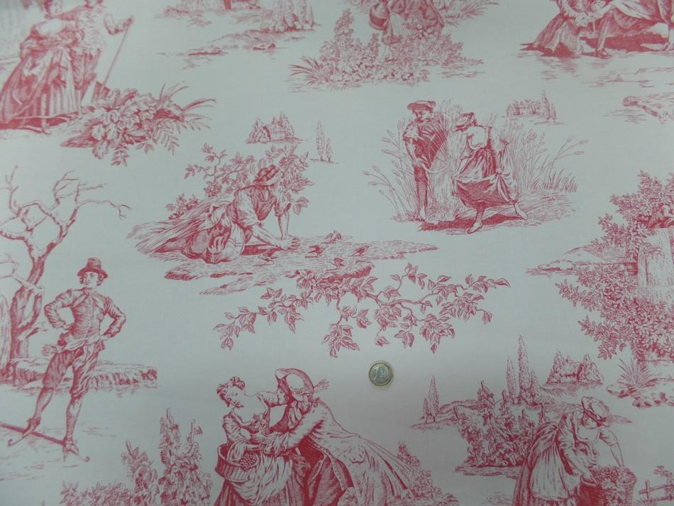 coton d ameublement imprimé toile de jouy , écrue, bleu ,rouge
