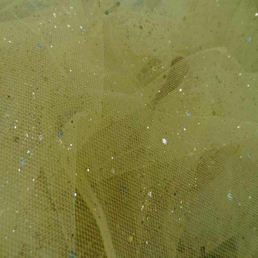 tulle a paillettes jaune doré, un peu raide , transparent . Il peut être utilisé pour la confection de volant de jupe, robe, déguisement, en décoration .