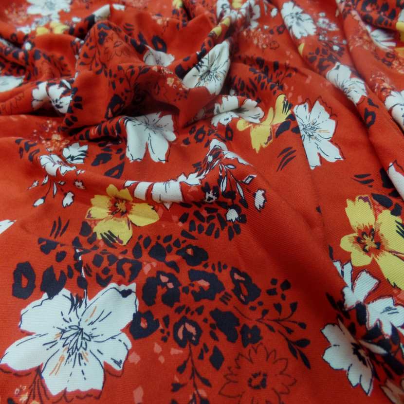coupon de viscose rouge imprimé fleurs noir,blanc et jaune safran 1.80m