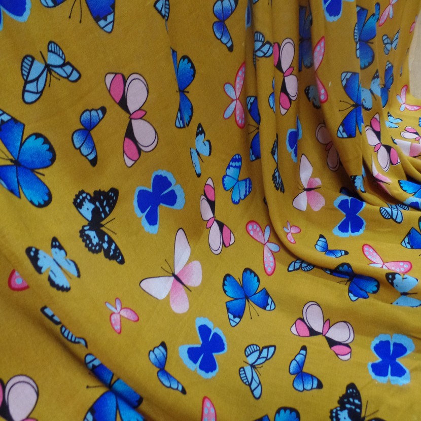 viscose moutarde fine imprimé papillon bleu et rose en 1.45m de large ,