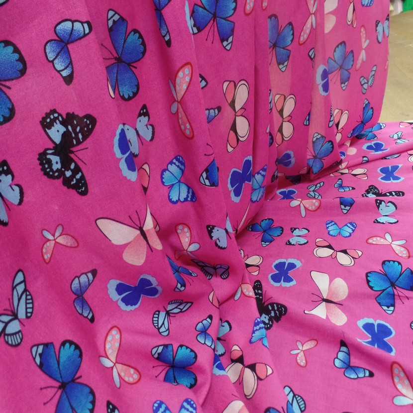 viscose rose fuchsia fine imprimé papillon bleu et noir en 1.45m de large ,