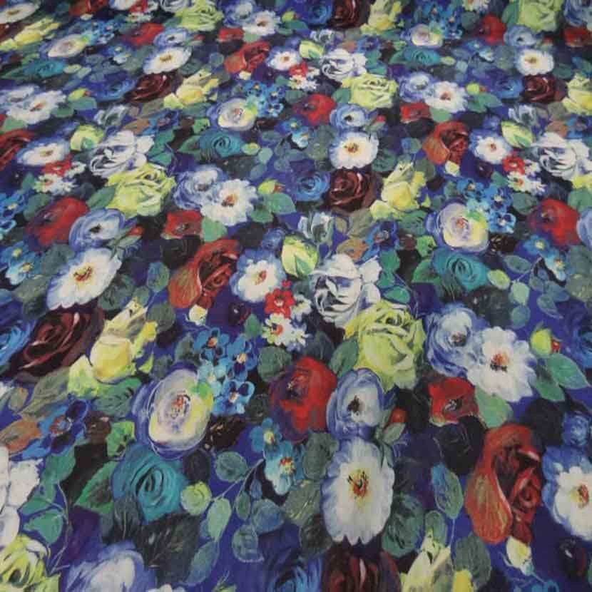 voile de coton soie sur fond bleu imprimé fleurs