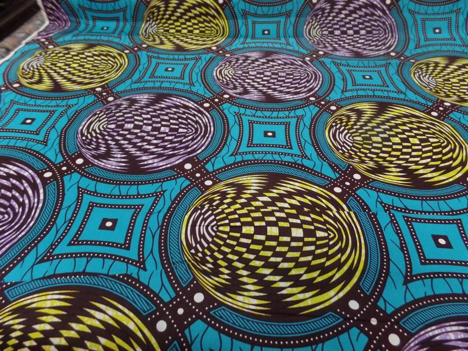 tissu wax bleu turquoise imprimé jaune ,marron et lavande